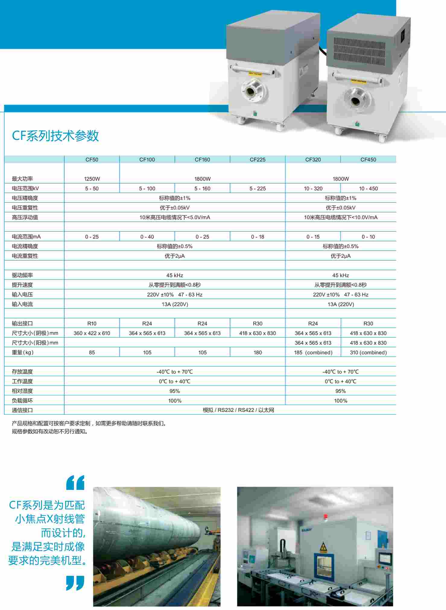 高美公司的CF系列射線機設(shè)計的最大功率為1800W,以匹配小焦點射線管。CF射線機可匹配各種50kv-600kv輸出電壓的管頭。