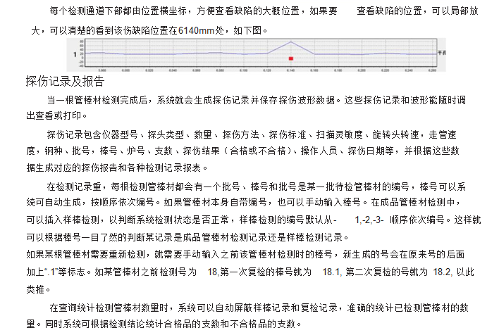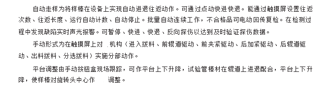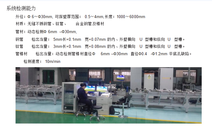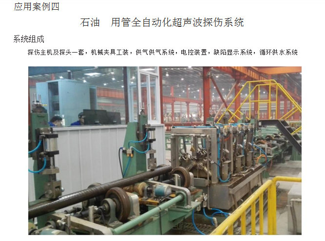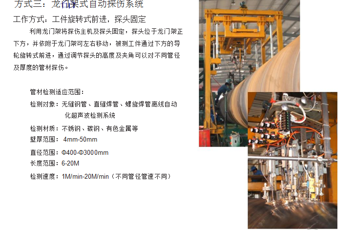 利用:龍門架將探傷主機及探頭固定,探頭位于龍門架正下方,并依附于龍門架可左右移動,被測工件通過下方的導輪虛轉式前進,通過調節(jié)探頭的高度及夾角可以對不同管徑及厚度的管材探傷。