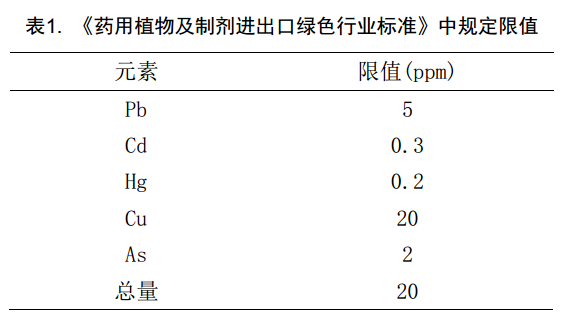 國(guó)外對(duì)于藥物中金屬元素的殘留量有嚴(yán)格限制。根據(jù)歐洲藥物評(píng)審委員會(huì)(EMEA) 頒布的金屬催化劑或金屬試劑殘留量限度規(guī)定,在藥品中可能殘留的元素分為3 大類(lèi)(Pt、 Pd、 Ir、 Rh、 Ru、Os、Mo、 Ni、 Cr、 V; Cu、 Mn; Fe、 Zn),其含量大多數(shù)較低,僅為mg /kg 級(jí)。 我們國(guó)家也有對(duì)于的規(guī)定,《藥用植物及制劑進(jìn)出口綠色行業(yè)標(biāo)準(zhǔn)》中對(duì)相關(guān)元素就有規(guī)定限值,規(guī)定值見(jiàn)表1.