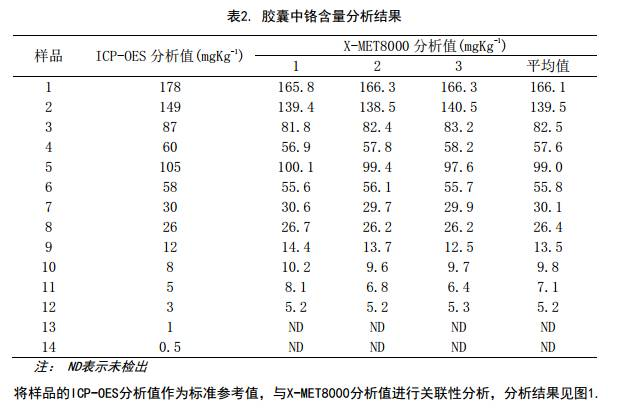從圖1可以看出,采用手持式XRF X-MET8000儀器能準(zhǔn)確分析膠囊中的鉻元素含量,能夠?qū)崿F(xiàn)現(xiàn)場(chǎng)篩選。