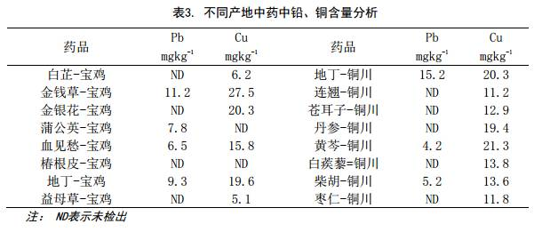 按照WM/T 2-2004《藥用植物及制劑進(jìn)出口綠色行業(yè)標(biāo)準(zhǔn)》中對(duì)相關(guān)元素就有規(guī)定限值,對(duì)陜西寶雞和銅川的不同中藥中的Pb和Cu含量進(jìn)行分析, 典型譜圖見(jiàn)圖2.