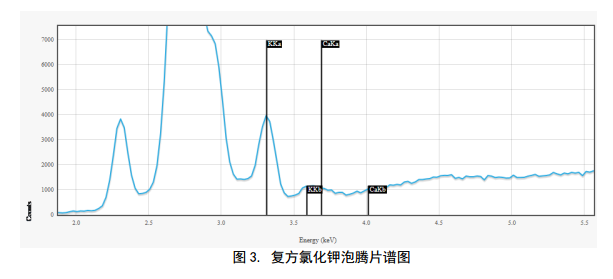 對(duì)于引起的低鉀血癥通常情況下采用電解質(zhì)補(bǔ)充藥,復(fù)方氯化鉀泡騰片則是一種電解質(zhì)補(bǔ)充藥。對(duì)于藥品里的鉀元素含量分析,藥典里都有闡述,但相關(guān)對(duì)不適應(yīng)現(xiàn)場(chǎng)快篩監(jiān)測(cè),采用牛津儀器X-MET8000系列HHXRF儀器可以進(jìn)行篩選,判斷成份含量。圖3是對(duì)藥品進(jìn)行譜圖掃描,鉀元素的譜線(xiàn)非常清晰。